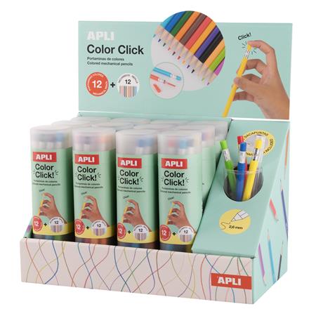 Farebné mechanické ceruzky, sada, displej, APLI "Color Click", 12 rôznych farieb, 12 sád/displej