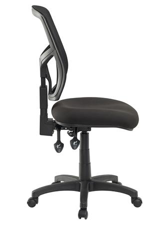 Kancelárska stolička s pohodlným sedadlom dizajnové prevedenie s hrubým, tvarovaným polstrovaním sedadla pre vyšší komfort pri sedení výškové nastavenie pomocou plynového piestu vyvýšené, priedušné sieťované operadlo výšku operadla je možné nastaviť pomocou račňového mechanizmu: jednoducho, jedným pohybom asynchrónna mechanika nastaviteľný uhol operadla nastaviteľný uhol sedadla dodáva sa bez opierok nosnosť: 130 kg Poťah: sedadlo: protioderová látka operadlo: napnutá sieťovaná tkanina
