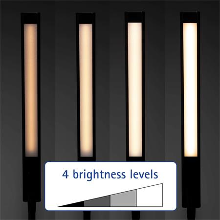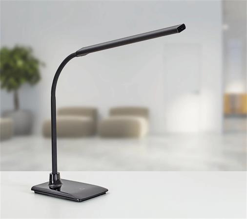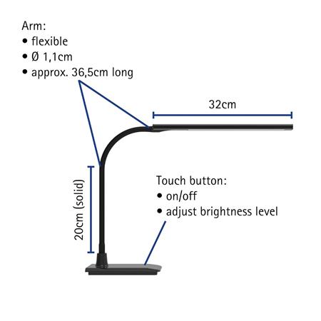 Energeticky úsporná stolová lampa vyrobená najnovšou technológiou LED. Ovládanie jasu, ktoré možno prispôsobiť aktivite a individuálnym potrebám. Čistý, decentný dizajn, harmonicky zapadá do priestoru. - svetelný zdroj: vstavaný LED panel, LED žiarovky sú vymeniteľné v tele svietidla - intenzita svetla: 726 lumenov, nastaviteľná v 4 úrovniach - osvetlenie: 1120 luxov vo vzdialenosti 35 cm - so stmievateľným dotykovým spínačom pre zníženie odtieňov - teplota farby: 3000 Kelvinov, teplá biela - priemerná životnosť LED: 50 000 hodín - priemerná spotreba energie: 6 kWh/1000 h - materiál ramena: kov, pogumovaný - materiál hlavy: hliník - dĺžka ramena: 38 cm - dĺžka hlavy: 32 cm - výška: 37,3 cm - hlava a rameno sa dajú naklápať a otáčať - vážený plastový podstavec, rozmer 16,7 cm x 12 cm - dotykový vypínač na podstavci - funguje zo siete 220/240 V - farba: čierna - záruka: 2 roky - hodnotenie energetickej účinnosti: E ??(na stupnici A-G)