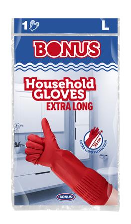BONUS Extra dlhé rukavice s hrubým materiálom a predĺženou dĺžkou poskytujú maximálnu ochranu a suchosť. Ideálne na ochranu pred podráždením čistiacimi prostriedkami a pred vysušovaním pokožky. Navrhnuté v súlade s požiadavkami segmentu HoReCa, vhodné aj na profesionálne a priemyselné použitie pri práci so silnejšími chemikáliami alebo drsnými povrchmi. Vzor včelieho plástu zabezpečuje pevný úchop. Dĺžka: 38 cm. Veľkosť: L.