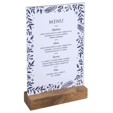Ideálny na vystavenie fotografií, informácií, jedálnych lístkov či ponúk na stole. -vyrobený z kvalitného akrylu  zvislá (stojatá) orientácia -priehľadný -podstavec z dreva -obojstranný -rozmery: 150 x 50 x 240 mm -odolný voči UV žiareniu