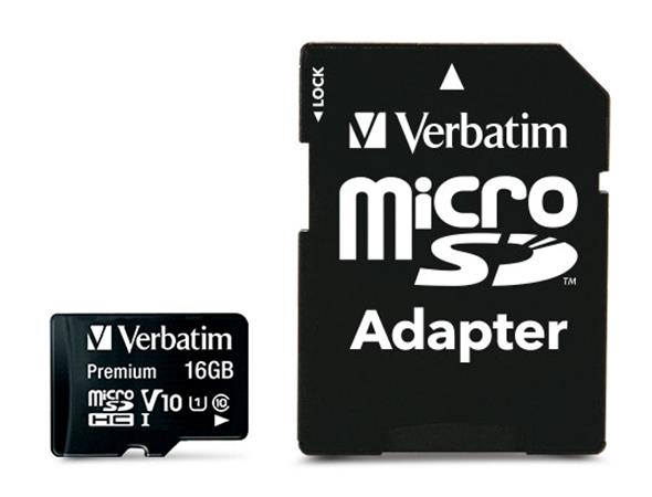 Pamäťová karta, microSDHC, 16GB, CL10/U1, 45/10 MB/s, s adaptérom, VERBATIM "Premium"