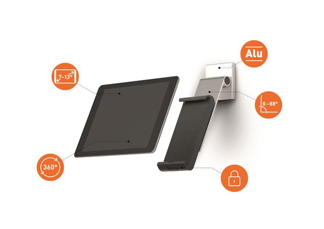 - proti krádeži, držiak je možné uzamknúť špeciálnym kľúčom a má integrovanú ochranu proti vytiahnutiu tabletu do strán