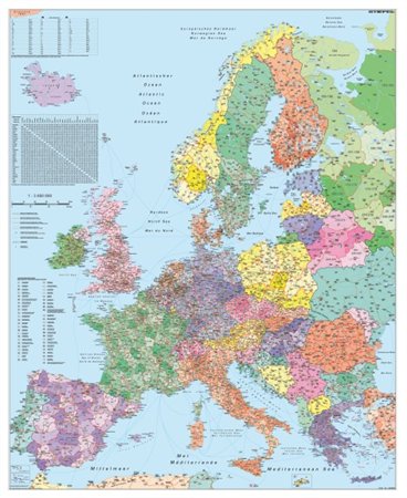 Nástenná mapa, 100x140 cm, kovová lišta, Európa, smerové čísla, STIEFEL - výrobok v AJ a NJ